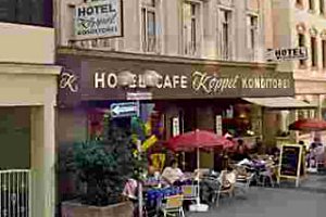![]() ![]() | Café-Hotel Köppel House Köppel is known for their café in the town center, which also includes a Hotel. Pricing for this hotel is done per person, not per room. You may book in single room or double rooms. Two of the double rooms have 3 beds, so this room type may be booked with either 2 or 3 people. Hotel homepage with Bf., in single room: Booked out with Bf., in double or 3-bed room: Booked out Hotel phone no: +49 6721 185790 |