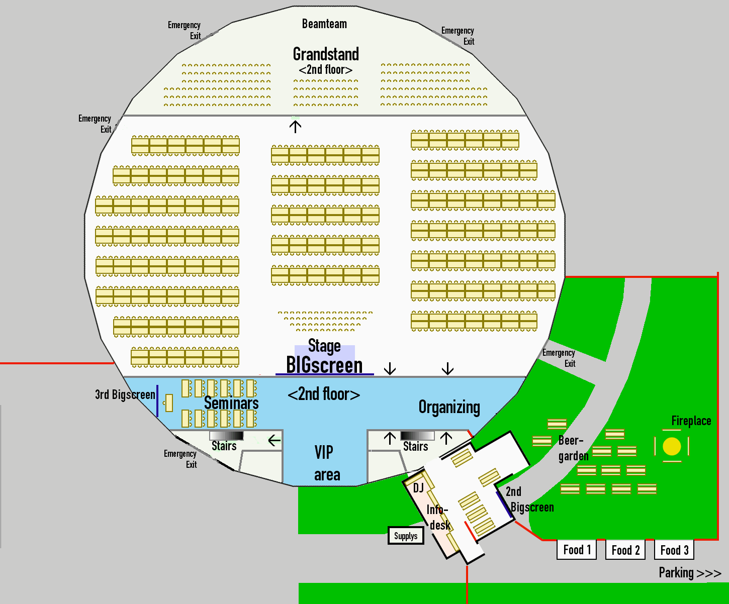 We're back at the location we've used from 2005 on, the "Rundsporthalle" in Bingen, with all its nice features, including plenty of space for seats, the grandstand which is perfect to watch competitions from, and the space for a gigantic bigscreen. We also feature a big new seperate seminar area (the school mensa across the street), lots of clean showers and toilets - and much more.