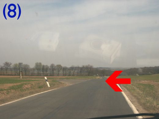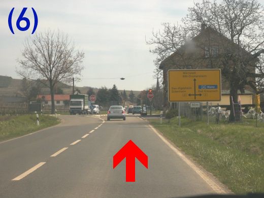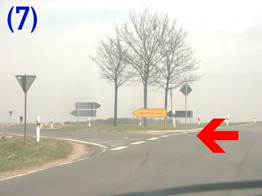 The roads inside Dromersheim are small, drive slowly please. After you have left Bingen-Dromersheim, the next village you'll come through will be Aspisheim, and then we go up the hill. At the top of the hill there is a crossing, where you need to go to the left, the sign reads "Appenheim". Point 7.